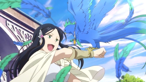 Shirayuki meets the woman who reveals that she is at the castle for a meeting with Zen but admits that she's incredibly nervous and finds comfort in speaking with Shirayuki. The woman introduces herself as Kihal Toghrul, the trainer of the bird, Popo. Kihal explains that she's from an island where there are many birds like Popo. The birds have exceptional hearing and can hear things from up in the sky to down in the sea by listening to the waves to detect mineral ores. Kihal then reveals her true reason for needing to see Zen. Despite her island being on the southern part of Clarines territory, it also overlaps with another territory wherein a new lord has dominion. The new lord and several of his friends have taken to hunting the birds and causing their numbers to dwindle as the birds feathers are a rare commodity that sell for a hefty price.