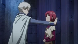 Shuka expresses his worry to Shirayuki that Zen and the other may not come back anymore because of the forts many mistake, feeling the fort must be an embarrassment to the prince. He mentions how Zen is very kind to all the soldiers and usually enjoys his visits there. Shirayuki assures him Zen is only thinking of their well being now, not their mistakes. She also says she hopes to see him enjoying his visit here at the fort again in the future.